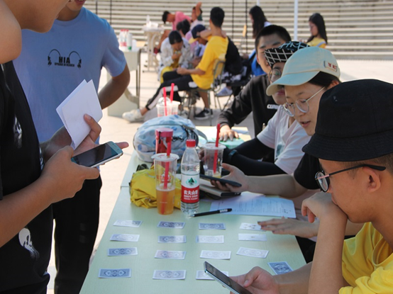 下午2点,活动正式开始。同学们首先于报名处完成团体赛报名后便依次进行6个趣味活动。在第一个环节—“奔跑吧,卡牌”活动中,所有队员在口令开始后快速跑上前一次一张翻开纸牌,在所有花色和数字都按顺序排放好后,由对应时间记录游戏成绩,这一环节同时考验着同学们的体力与智力。在随后的“乒乓球游戏”活动中,每个队员有三次机会扔出乒乓球计分,得分由乒乓球所进纸杯的位置决定,分为4分、3分、2分、1分;最终得分为所有队员所得分的平均分。