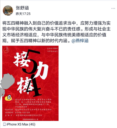 5月4日晚,我院环境类19-2班就五四青年节展开了一场线上研讨会。此次会议主要各位同学一起学习了习近平总书记的讲话,并从中体会到了其深刻含义;同期,还观看了央视特别节目《奋斗的青春最美丽》,支部成员均在观赏节目的同时,再一次使我们深刻体会到了当代青年的朝气蓬勃与应承担的时代重任。