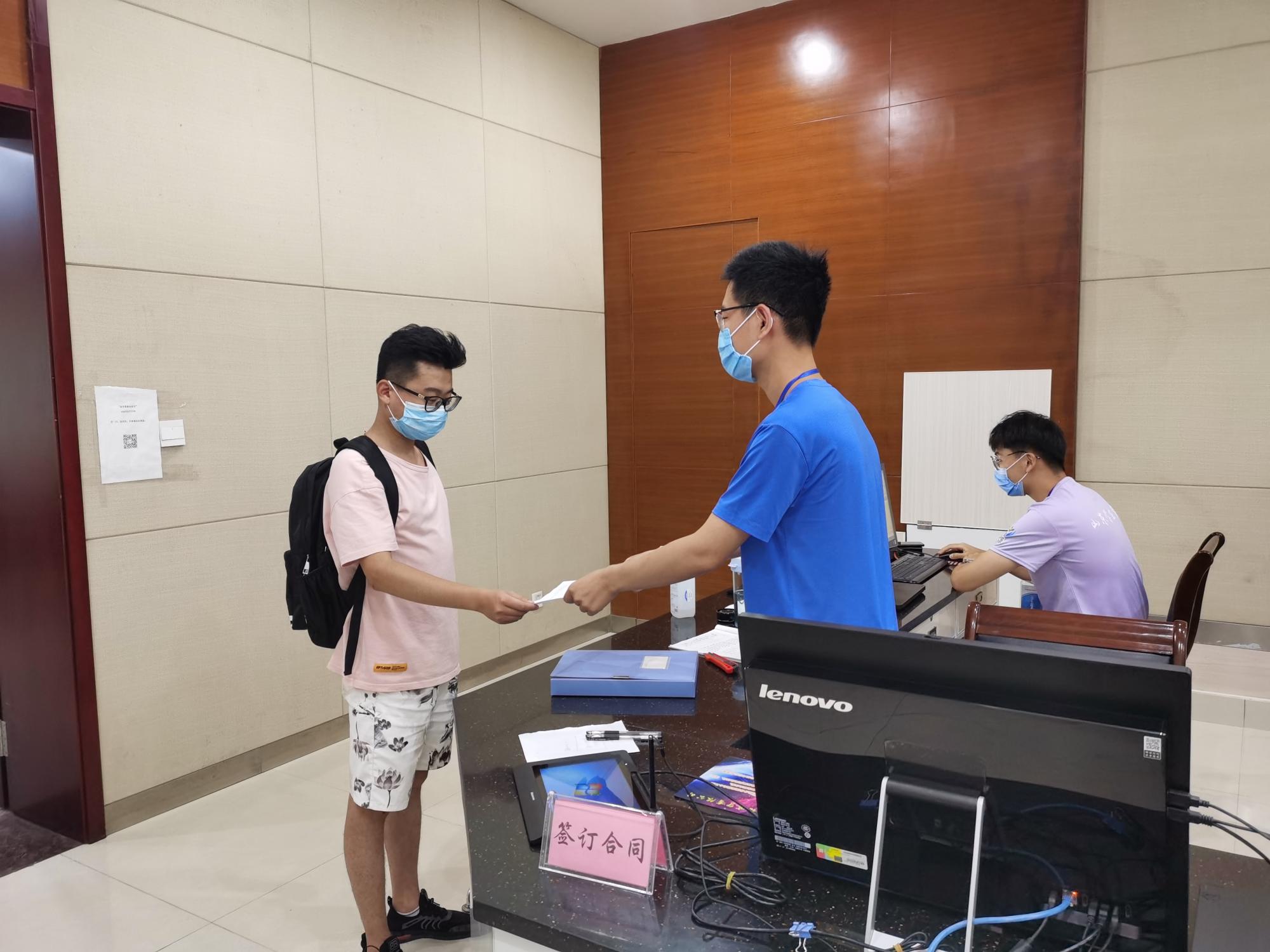 为了响应疫情防控,今年在现场办理生源地贷款业务的学生,首先需要佩戴口罩,接受体温测量,出示健康码。然后由实践人员进行助学贷款政策测试,通过测试后向实践人员提交证件材料,采集信息,签订合同。最后领取贷款合同及受理证明。随后,武成龙同学检查办理业务需要的相应材料是否充分。对于因升学需要信息变更的学生,是否输错院系、专业名称。武成龙表示,现场工作时,扫描证件、引导签字、打印材料都需要耐心一步步完成,十分能锻炼个人的细心与耐心。