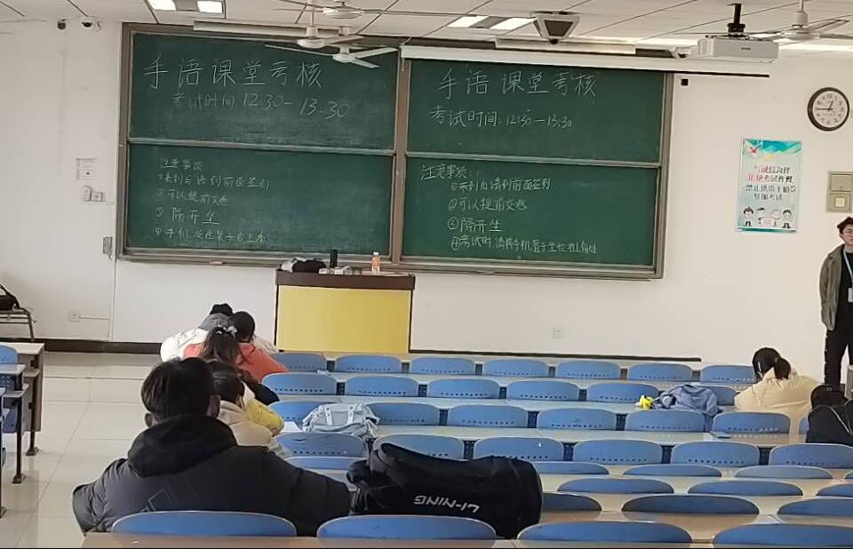 青协助教部开设了手语课堂,对参加的同学进行手语培训,培训内容主要为简单日常对话手语练习。考核内容分为笔试和视频两个部分,考试前,参加手语课堂的学员们按时到达考场,积极参加本次结课考试。下午13:30,笔试考核顺利结束,学员们交卷后有序离场,试卷将由手语栏目负责人进行批改,并根据成绩对学员进行奖励。随后,学员们自行录制手语教学视频,并于12月23日19:00前上交。最后,主办方根据笔试和视频成绩进行最终成绩统计,并公示获奖人员名单。