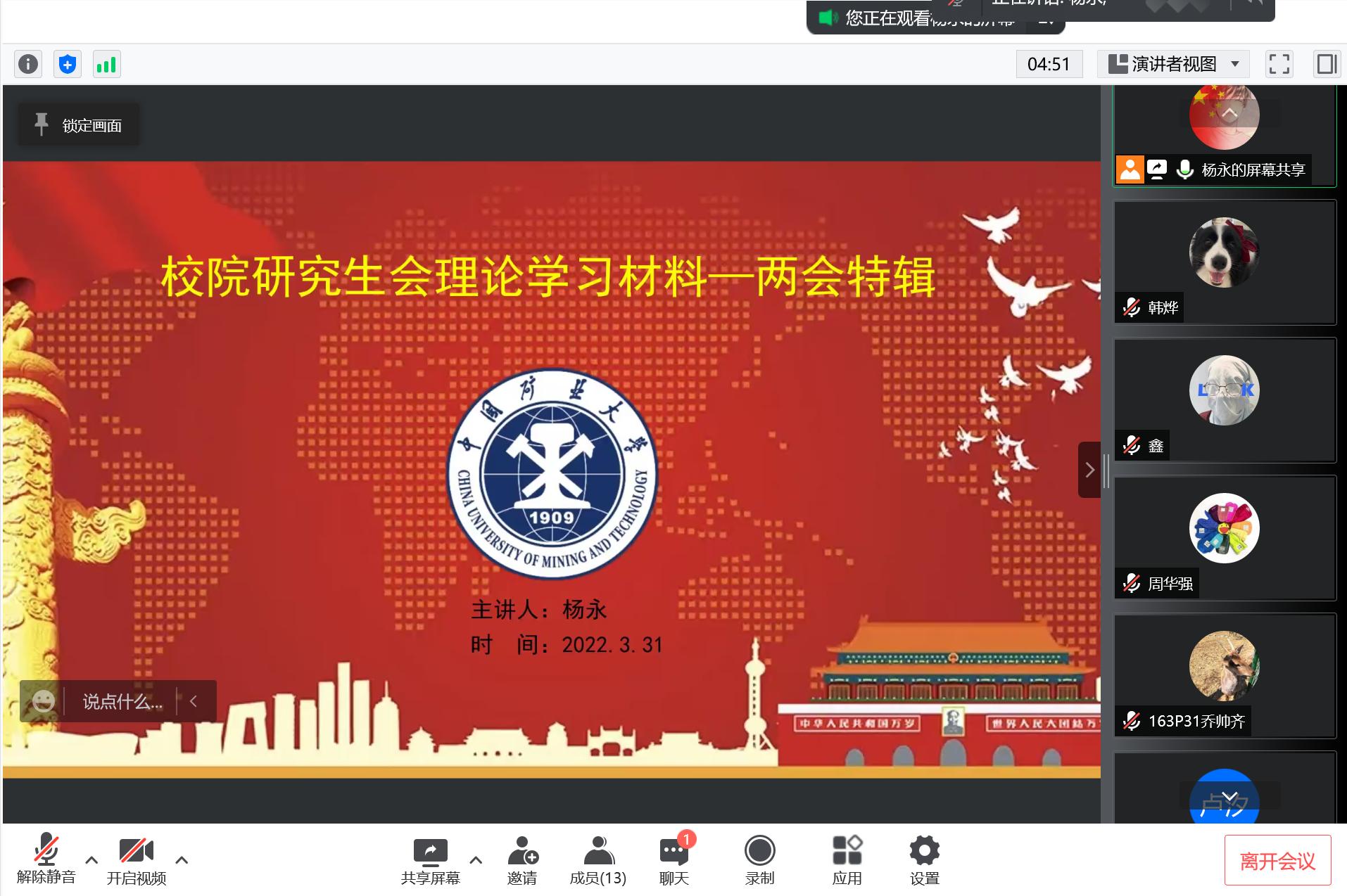 3月29日19时,我院研究生会举行了线上两会特辑理论学习,研究生会共14名同学参加了本次线上活动。本次学习内容主要分为政府工作报告、“习近平总书记话两会”和与两会相关的时政热评三个部分。