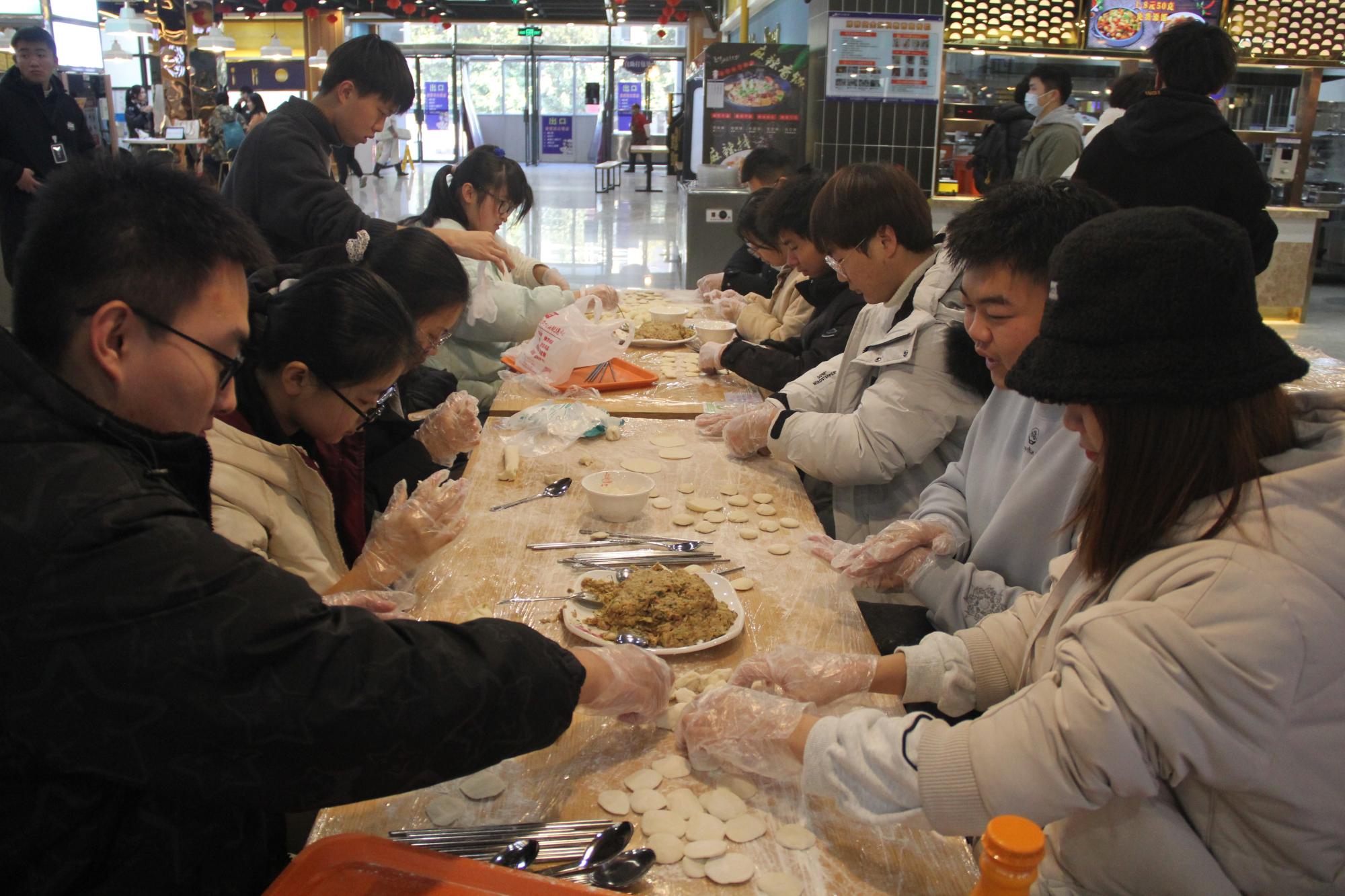 上午10时30分许,工作人员提前到食堂布置现场、分配材料,参与人员到场后到相应学院负责人处签到,按照签到表上的序号到对应餐桌就坐;参与人员在一食堂一楼一起包饺子,包好后由食堂帮忙煮饺子、同组组员一起吃饺子。工作人员现场拍照记录留念。