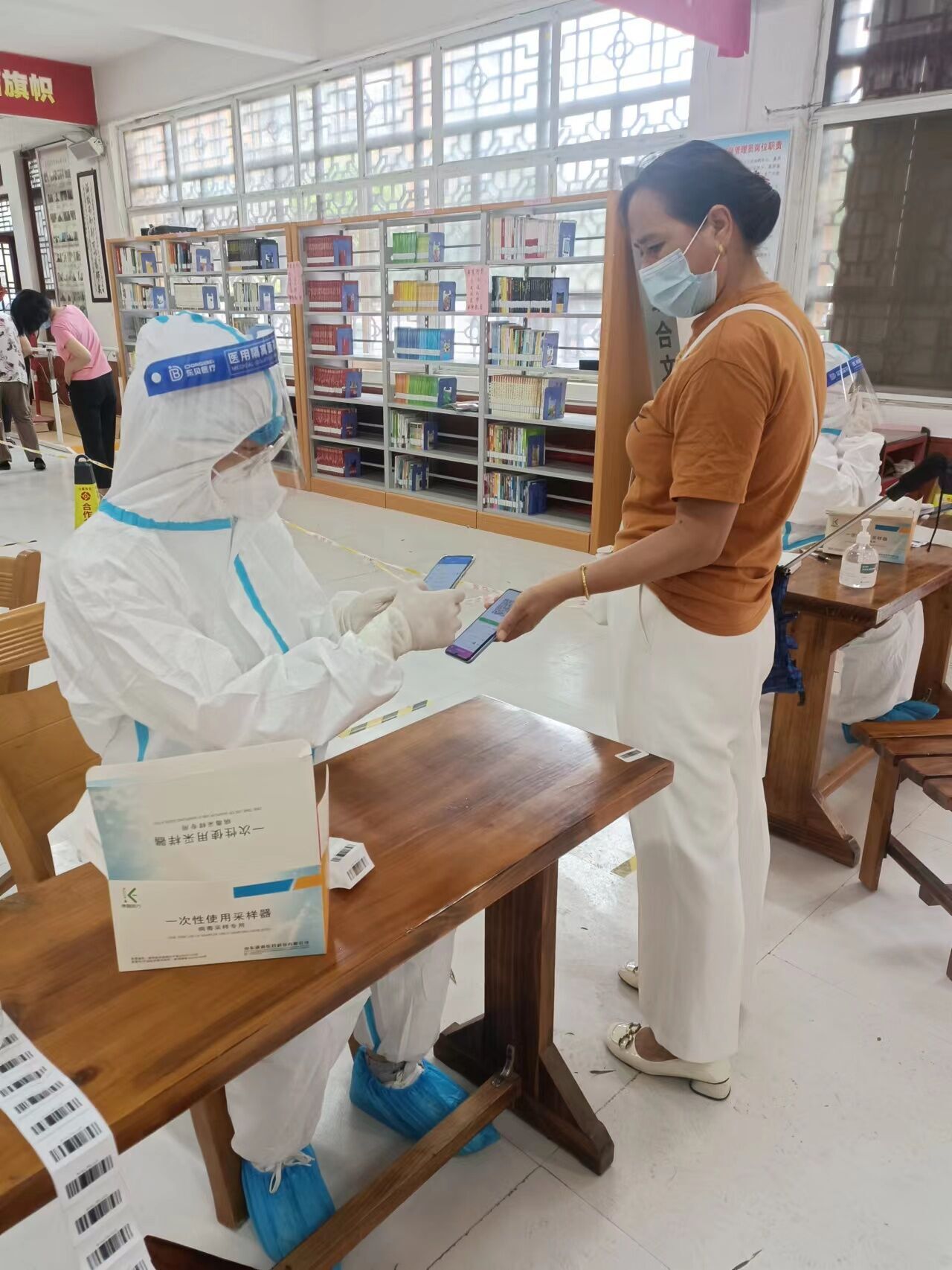金圣迪同学在暑假期间进行社会实践,参加了社区开展的实践活动,他在社区核酸检测点帮助来做核酸检测的居民们测量体温,并提醒大家扫描相应的二维码,维持现场的秩序,为核酸检测的顺利进行贡献了自己的一份力量。