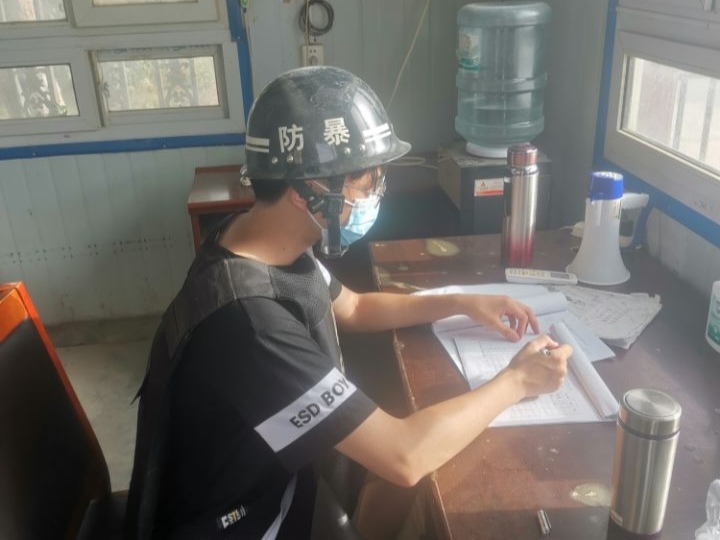 8月6日早上7时,胡明明同学穿戴好警服和警帽,在值班室开始自己为期一周的值班工作。胡明明同学主要负责对来访机关人员进行信息登记、测温,同时查看其行程码和48小时内核酸检测报告,对行程异常或未进行核酸检测的来访人员不予通行,并上报给机关干部,由机关干部人员对其异常问题进行处理。晚上11时,机关干部人员会对值班人员进行点名,同时值班人员汇报一天的值班状况。