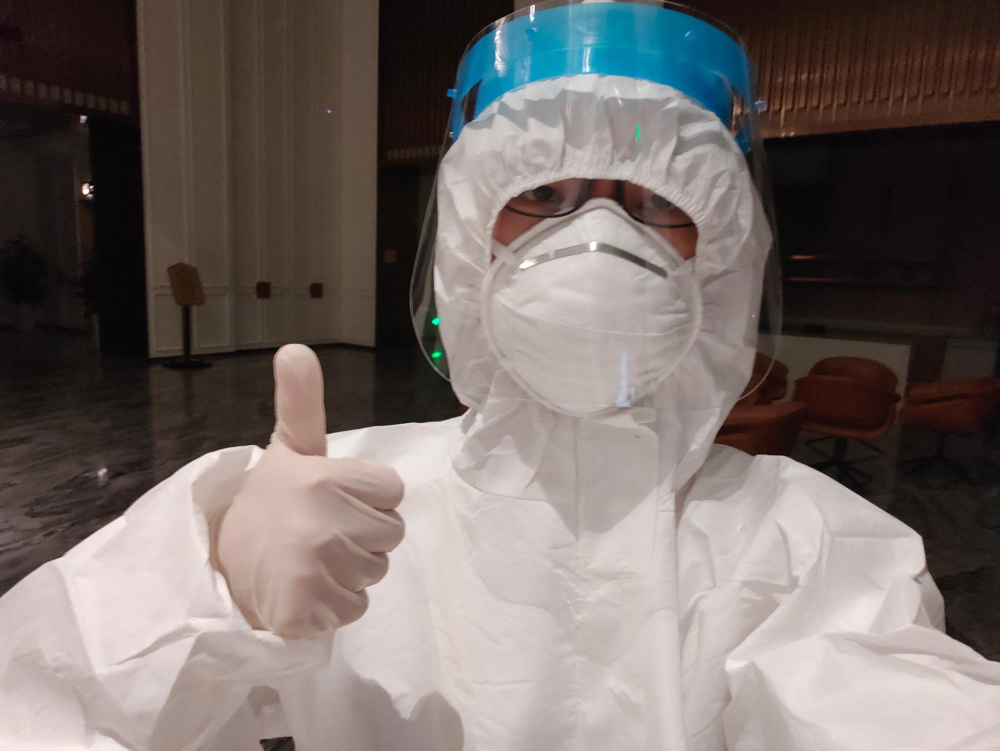 7月16日,东方美豪丽致酒店被新指定为集中医学隔离酒店,王智同学主动报名成为酒店夜晚值班人员。刚开始第一天下午接收隔离物资,如口罩、面具、防护服、手套、酒精等。第二天晚上,王智同学开始正式工作,同时酒店也开始接收隔离人员。第一次穿上防护服成为一名“大白”,王智同学首先感受到很新奇,但这种心情很快就开始被闷热所替代,最终工作了七个多小时。之后的晚上,王智同学主要负责禁止外人进入酒店和里面的人离开酒店,以及外卖和快递的签收与消毒,有隔离人员被送来就帮忙接收人员并对车辆、环境、司机和随车医护消毒。