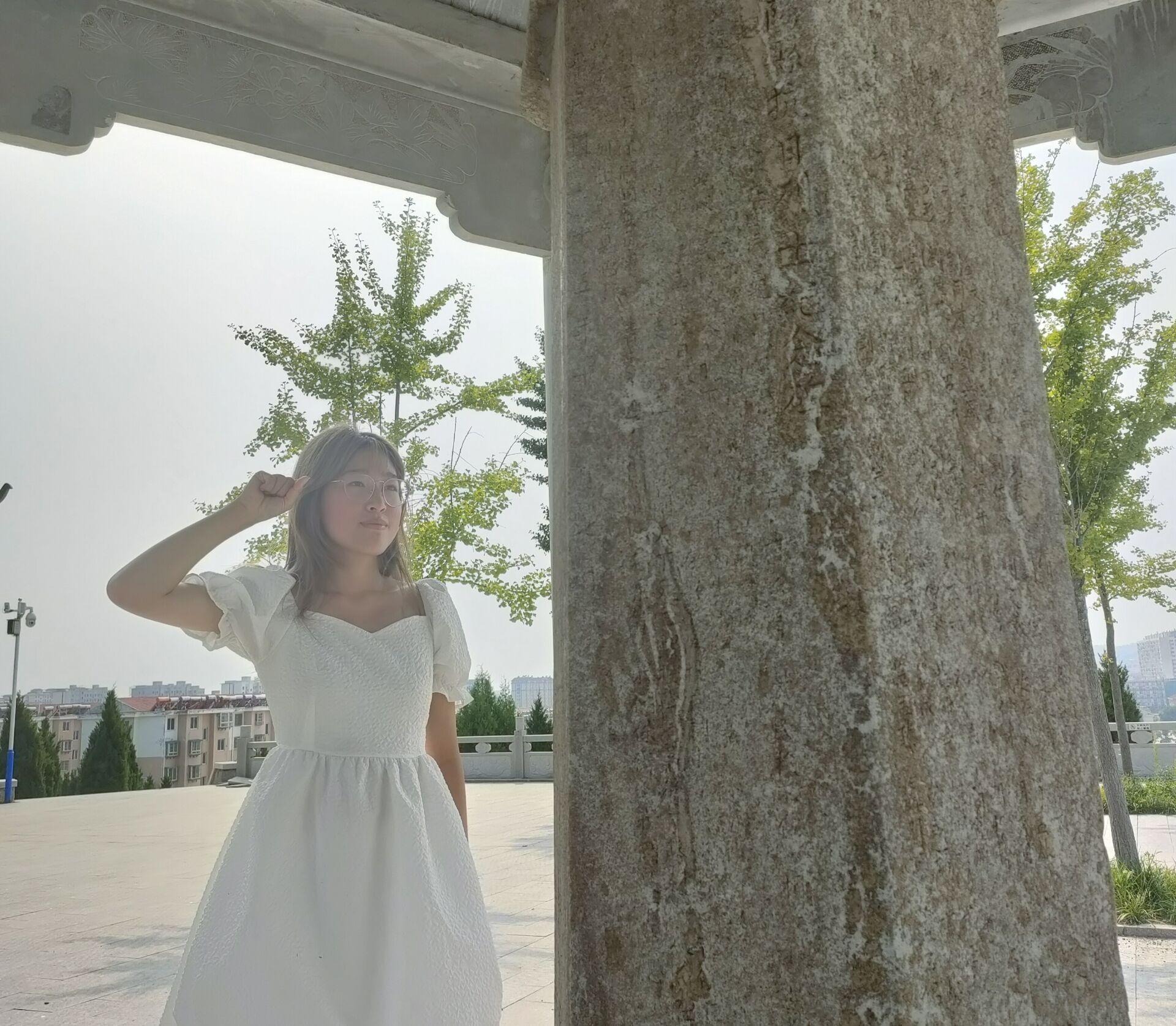 在炎炎烈日下,王莉同学来到海阳市烈士陵园,映入眼帘的便是伫立在几百阶梯之上的高高的烈士纪念碑。王莉同学怀着崇高的敬意,徒步登上百级阶梯。在高高的烈士纪念碑面前,收起抵挡烈日的太阳伞,对着纪念碑深深鞠躬。继续向后走去,是两座小亭子,中间的柱子上刻着抗日英雄的名字,这小小的亭子,庇护着历经风雨的烈士。王莉同学回望纪念碑,发现亭子之后印刻着烈士的英勇事迹。革命先辈为了中国的成立慷慨献身,使她再次深刻地理解了中国共产党对新中国的成立发挥的至关重要的作用。紧接着向后走去,是一排排整齐的烈士墓碑,黑压压的墓碑铺在整个松树林间,仿佛在诉说着,在那暗无天日的年代,中国劳苦大众惶惶度日、凄惨悲苦的生活和惨无人道的日本侵略军的侵华行为,没有先烈们的抵死抗争,就没有我们今天的安稳生活。