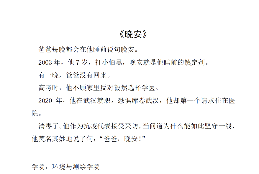 本次活动采用线上报名的形式。活动过程中,同学们踊跃创作,上交了许多优秀作品。活动参与人员将作品发送至学校学生工作处,学生工作处从征集作品中遴选出优秀作品在官方微博或微信公众号上进行推送。最后,学校组织评委就作品内容及其在官方微博、微信公众号等平台上的转发量、点赞量进行综合评审,并按最终成绩进行奖项评比。
