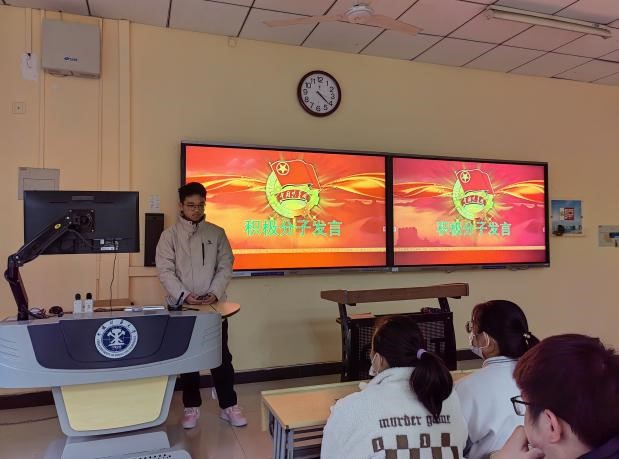 活动伊始,在主持人简单介绍了二十大的相关内容并引出活动主题后,由入党积极分子发言,刘永琦同学就二十大的开展并结合我们的实际生活,从而提出了当代大学生的爱国精神,要勇于担当民族复兴的伟大使命,又再最后强调了“砥砺奋进守初心, 青春献礼二十大”的非凡意义。随后主持人带领观看视频学习,同学们通过一段“从一大到二十大”剪辑坚定了同学们“永远跟党走”的信念,更加强了责任感和使命感。随后一首《有我》用一种年轻的方式向我们传达了用青春誓言奋进新征程的坚定决心。最后在主持人对二十大的金句热词进行了解读与朗诵后本次主题团日活动正式结束。