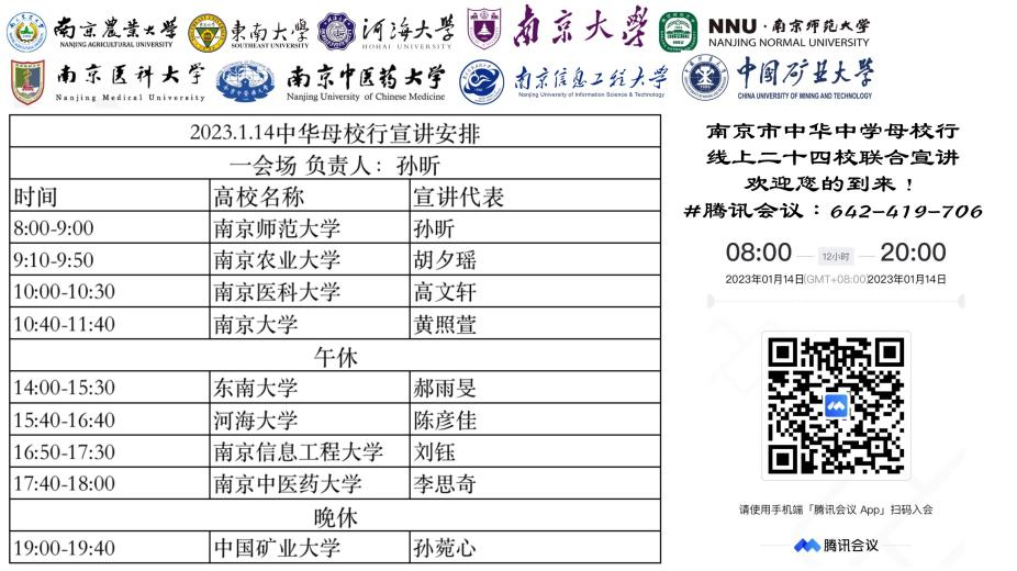 由于疫情原因,本次南京市中华中学母校行采取了线上宣讲的方式,提前将腾讯会议号告知高中班主任老师,并且联系年级教务处老师,呼吁高三同学能够抽出宝贵的一点时间来参加会议。为此,团队建立了专门的QQ群进行宣传和答疑。